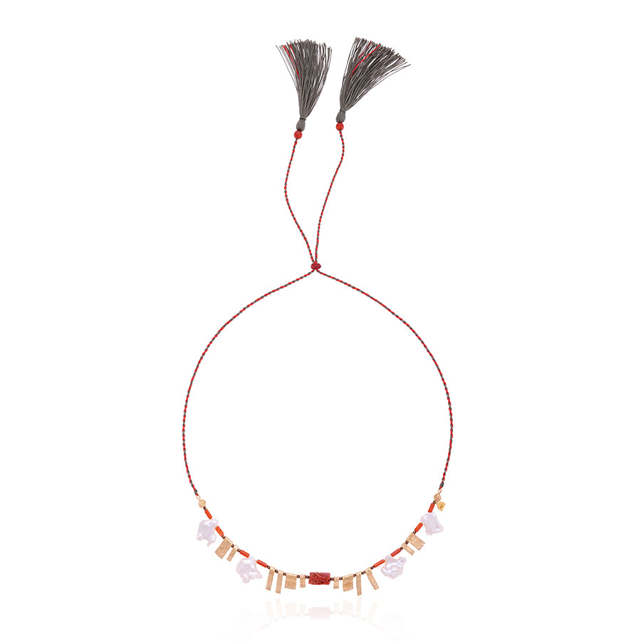 Gold Amulet Coral Cord Necklace with Green Tassel