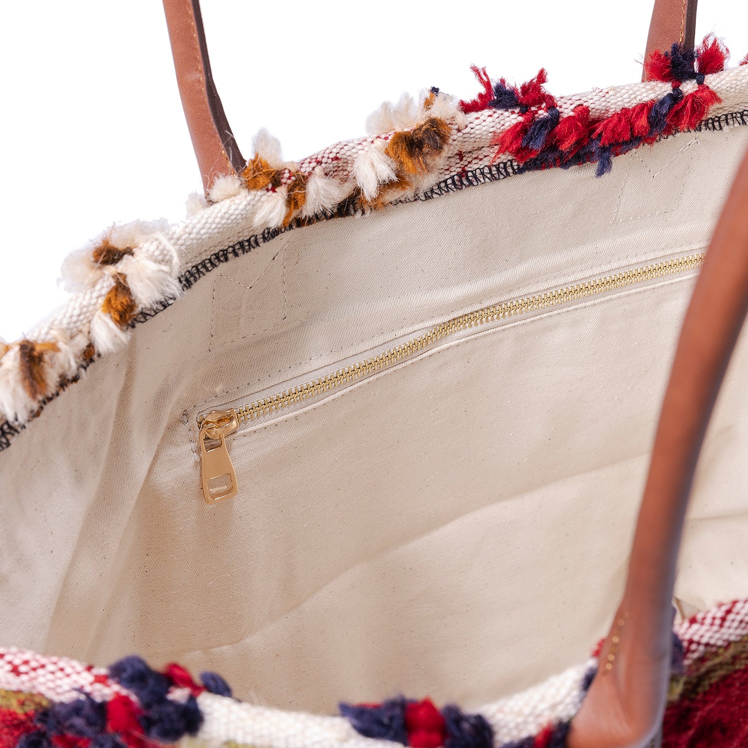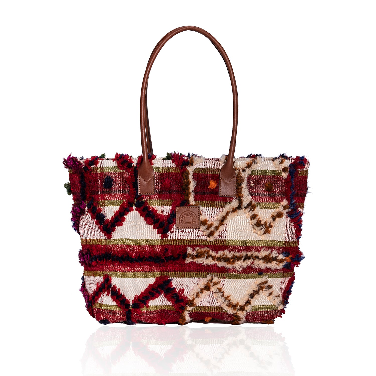 Crafted from an up-cycled hand-woven rug, ANU TEMPLE’s tote bag is handmade by the local artisans of Central Anatolia. A practical choice for busy commutes and days spent running errands, this chick bag's large interior has a large pocket to keep your essentials secure. The top leather handles are long enough to carry comfortably over your shoulder.